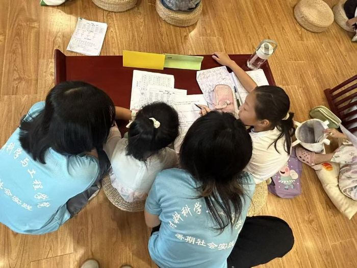 午后,活动室里弥漫着专注的气息,实践团成员开启了作业辅导环节。他们分组陪伴孩子们,针对语文、数学、英语等学科的疑问进行细致讲解:帮低年级孩子梳理字词,为高年级学生分析数学难题,指导英语单词背诵。遇到共性问题,还会集中讲解方法,鼓励孩子们互相讨论、共同解决。轻松的氛围中,孩子们高效完成作业,也养成了主动思考的习惯。