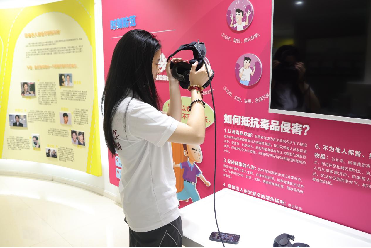 进入温州实践学校禁毒馆,该馆深度融合数字化技术,打造了集VR模拟、互动体验与智能管理于一体的禁毒教育体系。让学生身临其境感受毒品的危害。