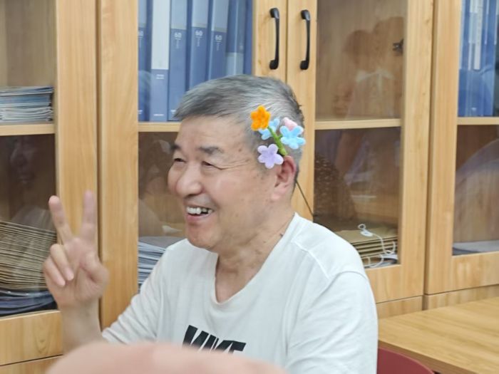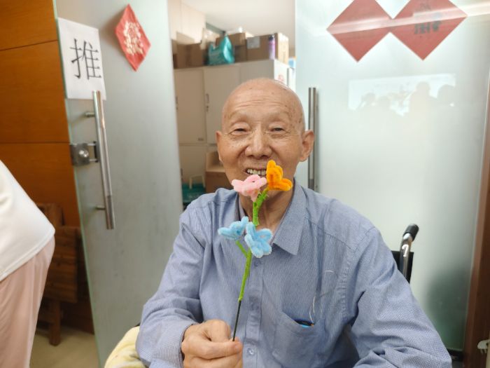 在接下来的扭扭棒手工课上,长者们在团队成员的帮助下,扭出一朵朵缤纷的小花,然后拼凑成枝。对着镜头,蒋阿姨和她的闺蜜头靠着头,就像手中的“不凋花”一样,笑得正灿烂。