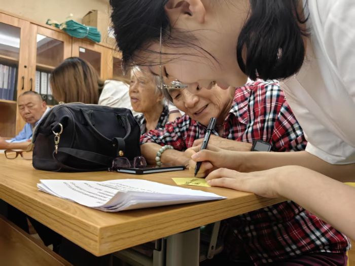 图为爱心护理院的长者们在填写卡片和调查问卷