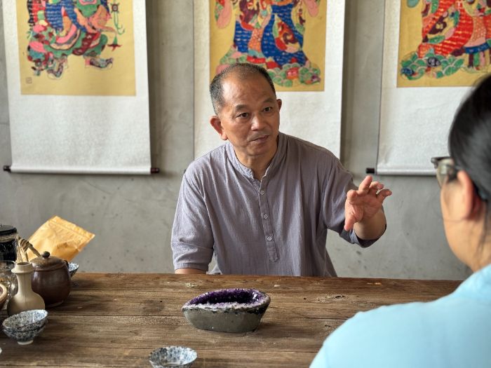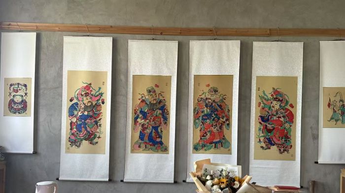 走进德合泰室内,琳琅满目的木版年画即刻映入眼帘,这些作品形态各异、色彩鲜明,其中以门神、财神等传统题材为主,线条灵动间尽显民俗韵味。