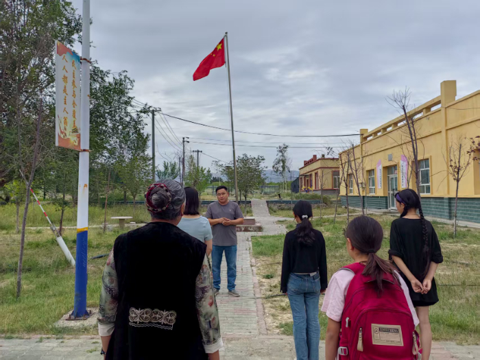 朝阳初绽,依尔喀巴克村党群服务中心前,村委会干部步伐铿锵,护送国旗走向旗杆。伴随着激昂的《义勇军进行曲》,鲜艳的五星红旗冉冉升起,实践队员与村民、孩子们整齐列队,面向国旗庄严行注目礼并轻唱国歌。这一刻,家国情怀在小村上空升腾,也让实践队员们更深体会到责任的重量。