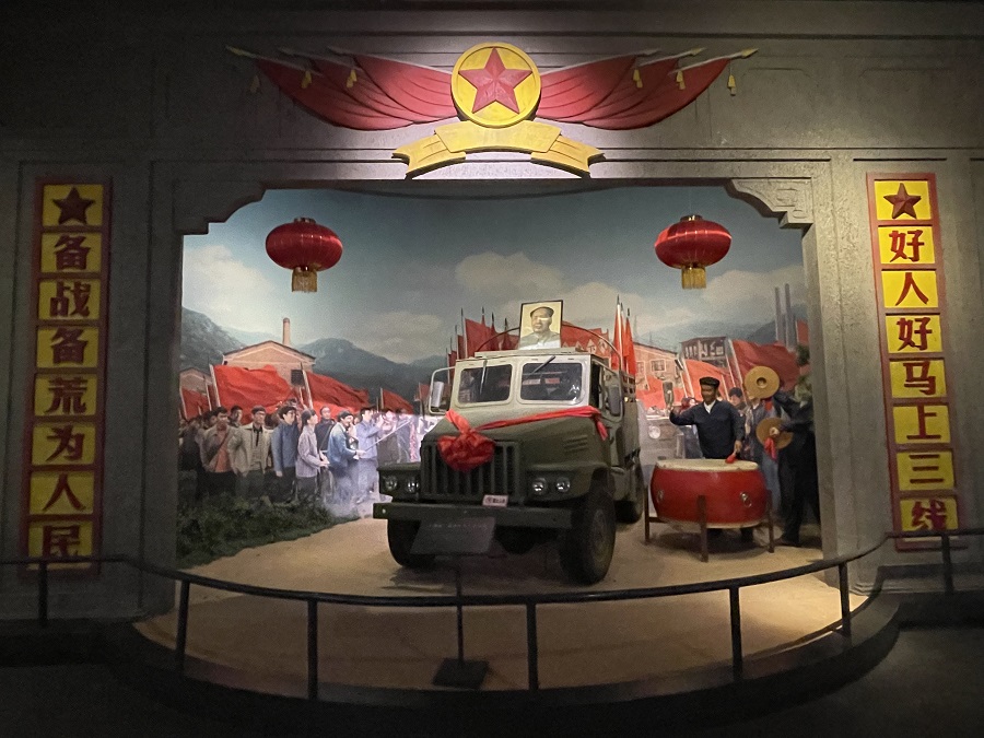 步入序厅,“备战备荒为人民,好人好马上三线”的巨幅标语瞬间将队员们带回那个激情燃烧的岁月。在“鲲鹏击浪从兹始”展区,通过全息投影技术还原的中央会议场景展现了20世纪60年代党中央作出三线建设决策的历史背景。队员们驻足于《向中央书记处汇报提纲》等文物复制品前,深刻体会到这一战略决策背后的深谋远虑。
