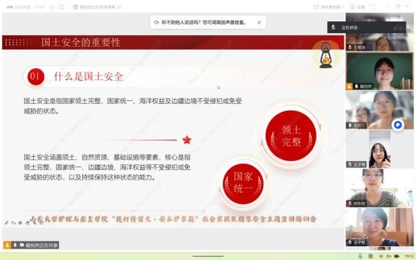 2025年7月23日,山东大学护理与康复学院"提灯传宿火·安本护家国"社会实践队召开国家安全主题宣讲专项培训会。队长戴悦然系统梳理团队既往宣教经验,提出"三化三适"原则:内容具象化、形式普适化、表达情感化。她强调,面对不同群体需将"总体国家安全观"转化为"谁都能读懂的安全经",为深入基层宣教奠定方法论基石。