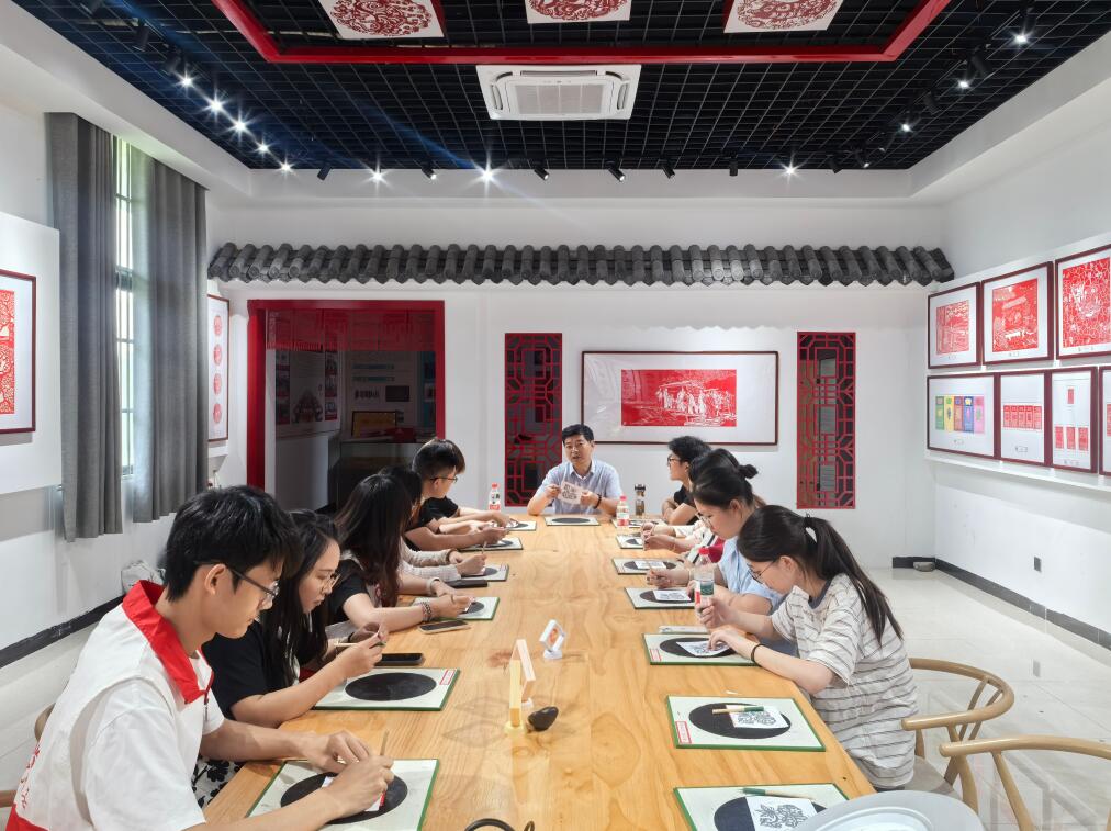 沉浸体验,感受非遗魅力。实践团成员在非遗传承人张仁高老师的指导下,于动手实践和亲耳聆听中感受非遗魅力。刻纸桌前,成员们屏息凝神,执起刻刀,于方寸纸间游走,“柿柿如意”的纹样逐渐跃然纸上;亲手触摸鼓面,学习击打节奏,尝试模仿韵味悠长的唱段。“一刀一刻、一鼓一韵,亲身体验后才真正懂得何为匠心,也更深刻理解了张老师‘让文化在年轻人手中传承下去’的执著信念”。团队负责人李欣芯说道。