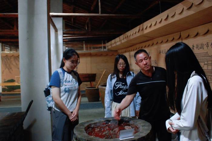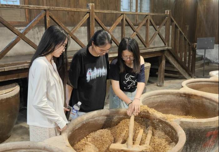 在古法酿醋工坊,实践团成员在传承人的指导下亲手体验了翻醅这一传统工艺,他们循古法翻动醅料,感受原料质地的变化,在汗水与谷物的清香中,真切体会到传统酿造“一分耕耘一分滋味”的坚守,感受到“手作”的温度。