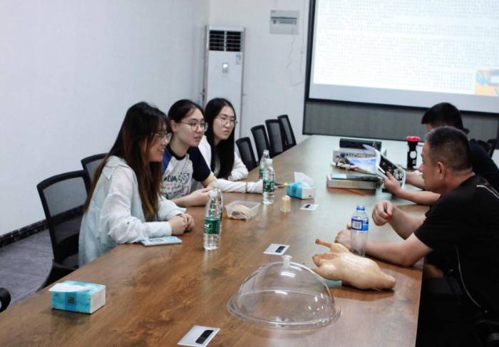 图为非遗工坊负责人马晓宇、非遗传承人马兆凯为实践团成员讲解南京板鸭、盐水鸭的相关知识。赵悦彤供图