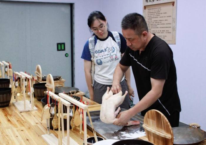 图为非遗传承人马兆凯向实践团成员展示南京板鸭、盐水鸭制作技艺。赵悦彤供图