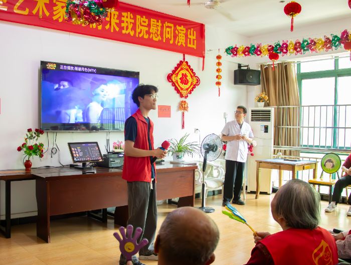 活动伊始,志愿者们登台献唱。舒缓的《荷塘月色》旋律响起,老人们凝神细听,仿佛置身静谧荷塘;激昂的《我和我的祖国》点燃全场热情,老人们自发挥手,与志愿者深情合唱,歌声中满溢爱国情怀;雄浑的《强军战歌》更唤起一位老兵的豪情,他激动分享军旅岁月,眼中闪烁自豪光芒。现场掌声不断,气氛热烈。
