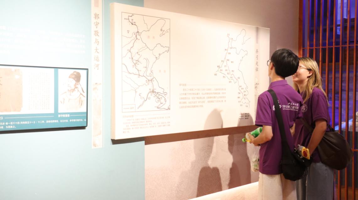 步入这座文化殿堂,实践团成员首先在序厅驻足,整体感知博物馆的叙事脉络与精神内核。随后,成员们分组徜徉于各个主题展厅,开启了一场穿越时空的自主研学之旅。展厅内,成员们凝神屏息,目光流连于那些历经沧桑的斑驳陶器、古朴渔具,它们无声诉说着湖区先民的智慧与生活图景;指尖轻抚泛黄的文献、珍贵的照片,字里行间与光影交错中,京杭大运河千年的帆影桨声、商贾云集的繁华盛景仿佛重现眼前;驻足于精心复原的渔家水街、革命场景前,独特的水乡风情与那段烽火连天岁月里军民同心、浴血奋战的壮烈史诗扑面而来。通过文物、史料与场景的立体交融,微山湖的自然造化之美、历史演进之迹以及其中蕴藏的坚韧、包容、抗争的人文精神,在成员们心中逐渐清晰、丰满。