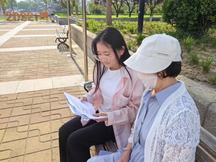 图为实践团成员在公园长椅上向群众讲解政策。杨柳然供图