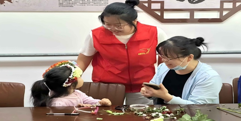为弘扬传统文化,丰富社区精神文化生活,7月17日,聊城大学马克思主义学院青耕志愿服务队于山东省德州市宁津县宁城街道阳光社区党群服务中心开展“巧手簪花承古韵,童心传趣续雅情”社会实践活动。