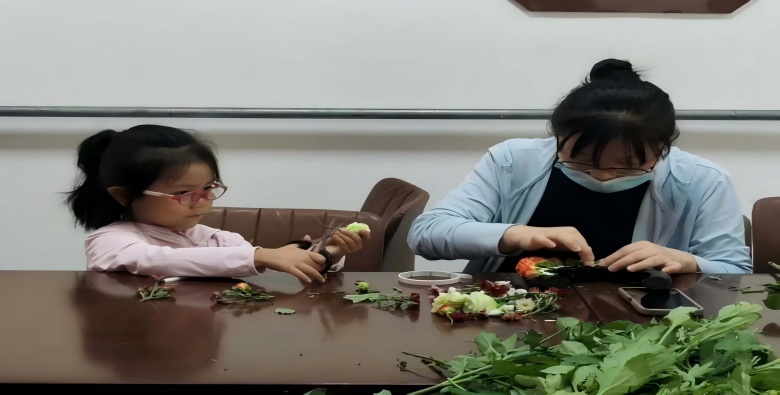 活动现场,志愿者首先为居民们生动讲述簪花文化——从古代礼仪中的郑重佩戴,到如今作为传统文化符号的深远意蕴,让千年雅韵在讲述中鲜活起来。经过知识的熏陶,亲子家庭深受启发,兴致盎然地投入创作。孩子们化身小小设计师,大胆组合缤纷花朵;家长们则耐心协助,指尖传递的不仅是技巧,更是温馨的亲情纽带。志愿者们穿梭指导,从修剪花枝到构思造型、固定花瓣,细致示范每一个环节,现场暖意融融,笑语不断。