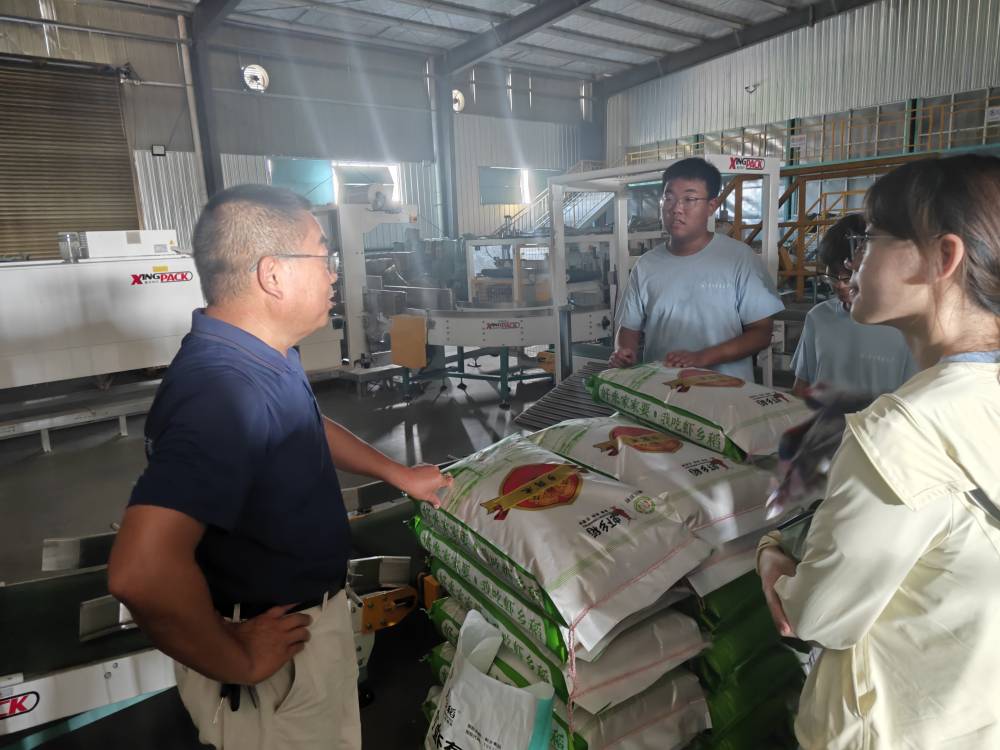 清晨的湖北虾乡食品股份有限公司,自动化生产线的运转声勾勒出现代农业的繁忙图景。实践团在公司负责人带领下,参观了虾乡稻米全流程加工产业链:气动胶辊砻谷机精准完成壳米分离,色选机按色泽体态对米粒分级,抛光机赋予稻米温润光泽,从加工到包装、搬运的全环节均由机械臂协同完成,大幅降低人工成本。