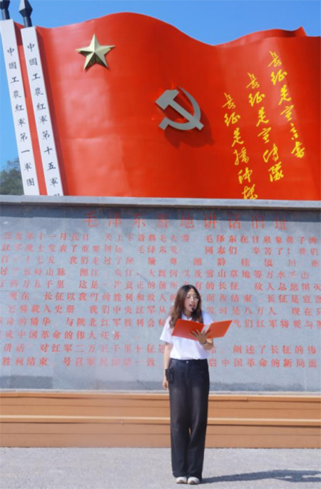 实践团成员李丹阳在甘泉雪地讲话旧址进行主题演讲。董金涛 供图