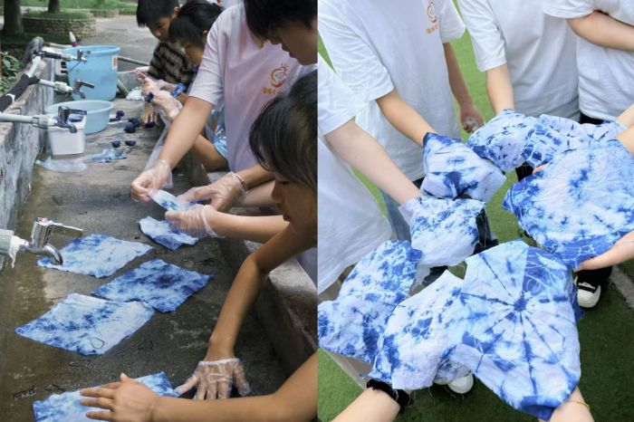 “明天我要带着孩子们做扎染,感兴趣的大朋友们也可以来听哦!”例会时队员王弈心兴奋地邀请大家与孩子们一起体验扎染课程。第二天扎染课上,孩子们攥着白布边角认真缠蓝线,结打得歪歪扭扭却紧抿嘴角。浸缸里捞起时蓝白花纹顺着水痕晕开,惊呼声混着笑闹,扎染布晾晒着,在穿堂风里轻轻晃悠。