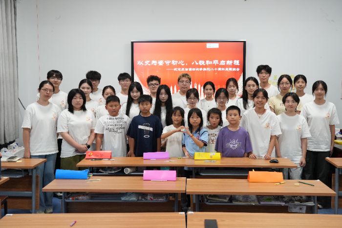 今年刚好是纪念反法西斯战争胜利80周年,这样的关键的节点不仅是民族的集体记忆,更是当代青少年理解和平、责任与家国情怀的鲜活教材。与孩子们第一周相处下来,支教团的大家发现,许多孩子对于战争和历史的认知停留在课本文字,缺乏更多的情感共鸣。在这样的基础上,支教团的大家共同策划了一场别开生面的班会。通过情景剧的演绎,“传递情报”等游戏的互动,还有共同创作和平心愿墙等环节,让孩子们从“被动的接受”到“主动的感知”。在这样一场历史与现实的对话中明白今天和平的来之不易,更思考自己作为“和平一代”的担当。“希望孩子们能铭记今天的感悟,从小树立责任意识,只有这样,历史才能真正的‘活’在孩子们心中。”支教队员周子祁道。
