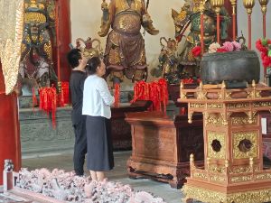 实践团成员抵达玉皇宫时,古建群与周边现代化社区相映成趣。这座坐落于工业园区斜塘的道教宫观,地理区位独特——东望吴淞江,西临金鸡湖,南接独墅湖,北依阳澄湖,十亩占地间,三路建筑格局井然有序,既遵循传统道教宫观规制,又融入了地方历史记忆。据工作人员介绍,玉皇宫始建于2007年,2008年11月11日落成开光,现为苏州工业园区道教协会所在地,是园区重要的传统文化地标。走进玉皇殿,不少市民正虔诚焚香。他们俯身跪拜,或祈求风调雨顺、家人安康,或寄托对生活的美好期许,传统信仰的生命力在当代生活中持续延续。