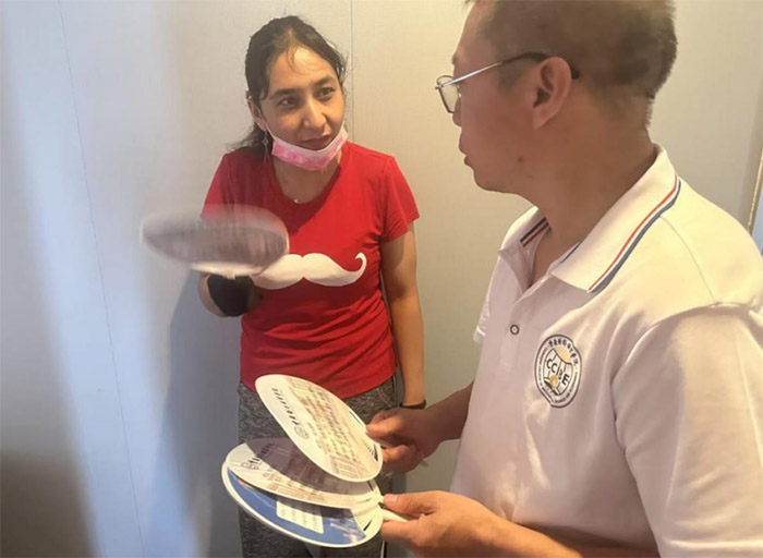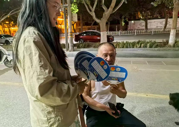 “大妈,这把扇子您拿着,扇面上的口诀要记牢,遇到陌生人要钱可千万别轻易答应!”实践团队长陈美宇一边将印有反诈知识的宣传扇递到村民手中,一边耐心讲解。这把精心设计的宣传扇,成为本次活动的“明星道具”——正面印着“三不原则记心上”“陌生来电多警惕”等朗朗上口的防骗口诀,搭配生动漫画,让村民在纳凉时就能轻松学习;反面则清晰展示着重庆对外经贸学院培“培元致新”的校训和应用型本科院校的办学定位,扇子既是实用工具,更是实践团的“青春名片”。在棋盘13村社区的巷道里,队员们分成若干小组,带着百余把宣传扇挨家挨户走访。遇到正在门口择菜的老人,便蹲下身讲解保健品诈骗的常见套路;碰到忙于农活的中青年,则重点提醒网络贷款、虚假购物等新型骗局。村民阿依古丽拿着扇子高兴地说:“这扇子太实用了,不仅凉快,上面的话我孙子也能看懂,天天提醒我别上当。”