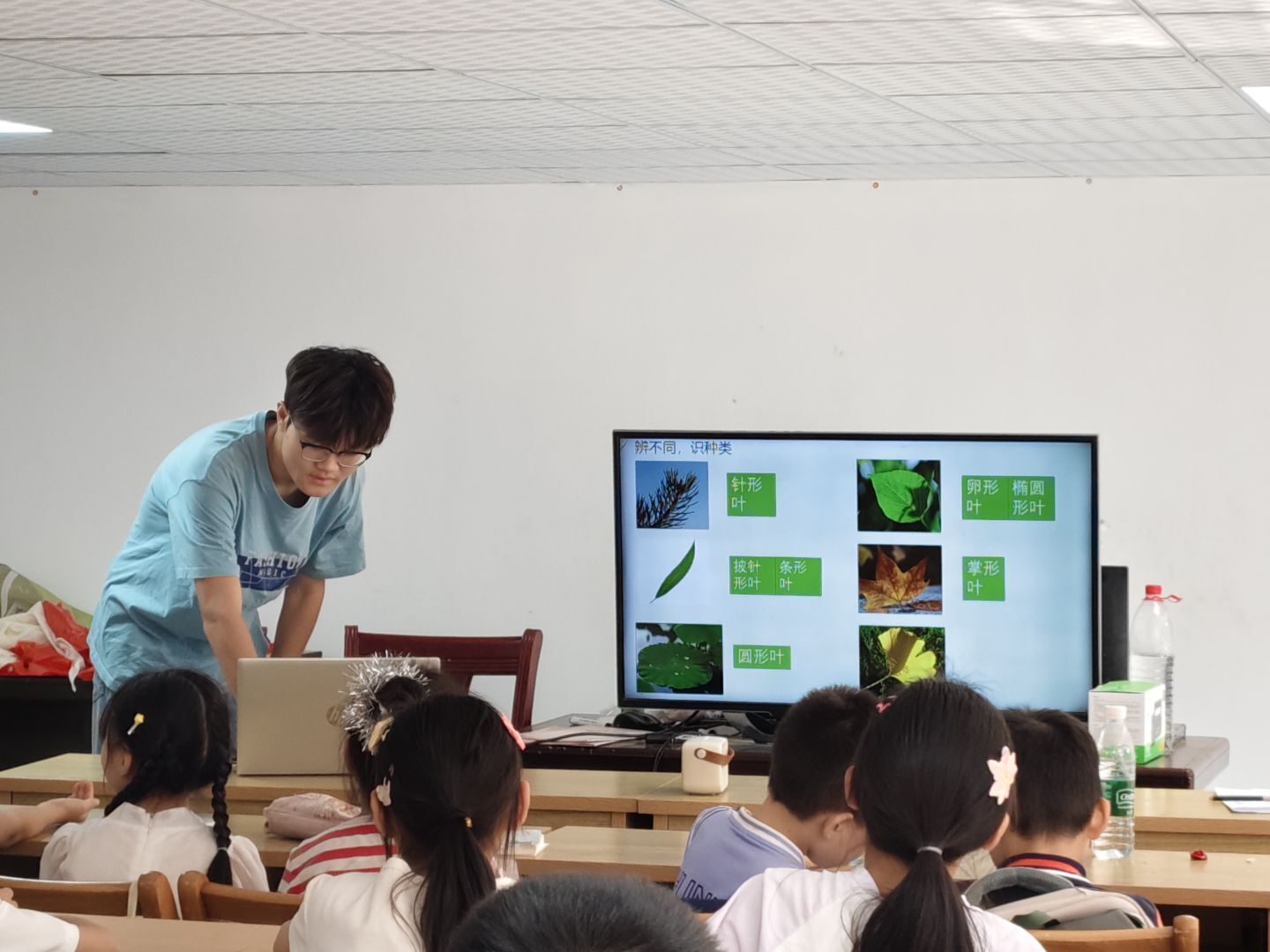 (张宝增向孩子们展示不同种类的叶片 乔金格摄)