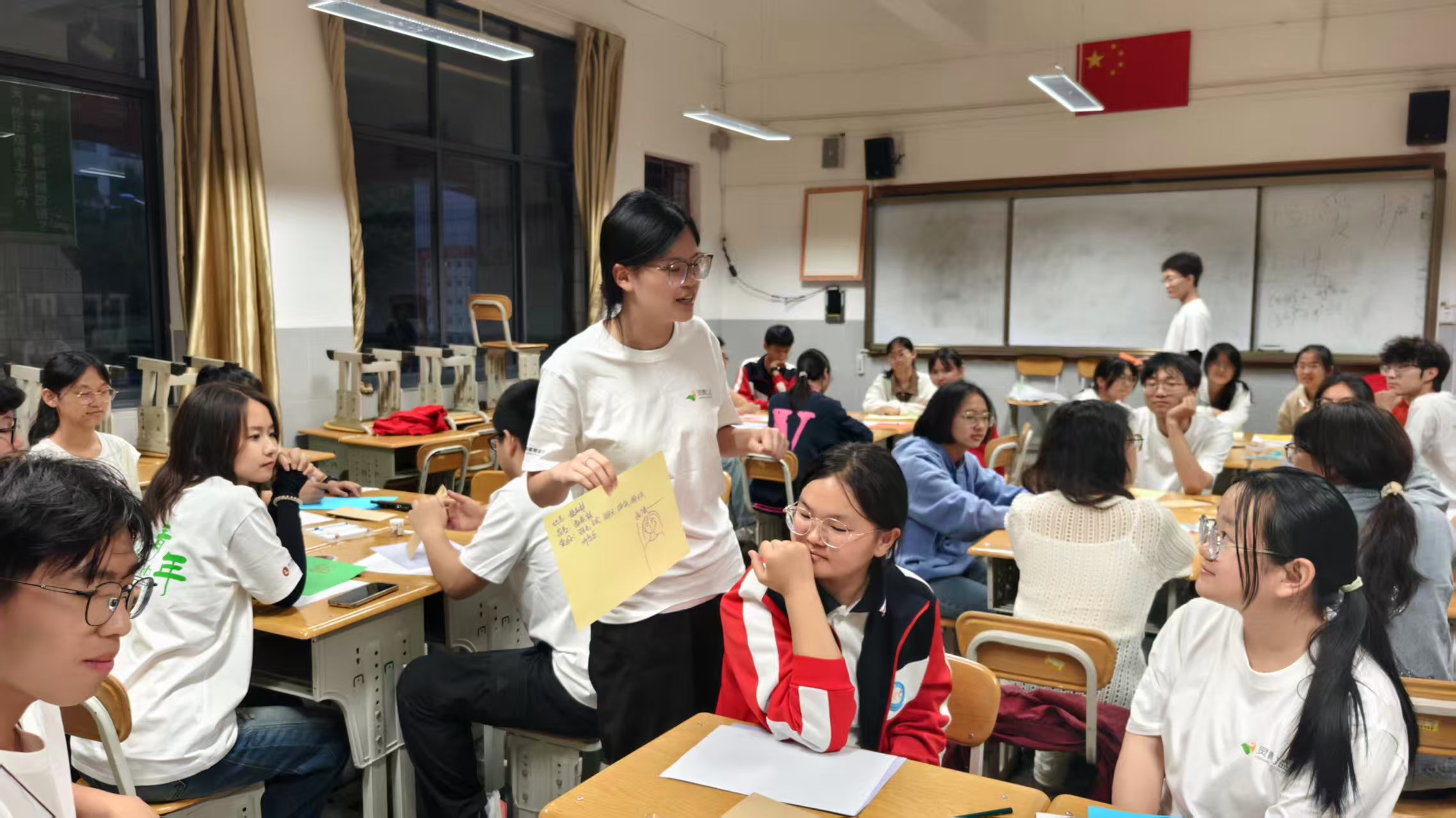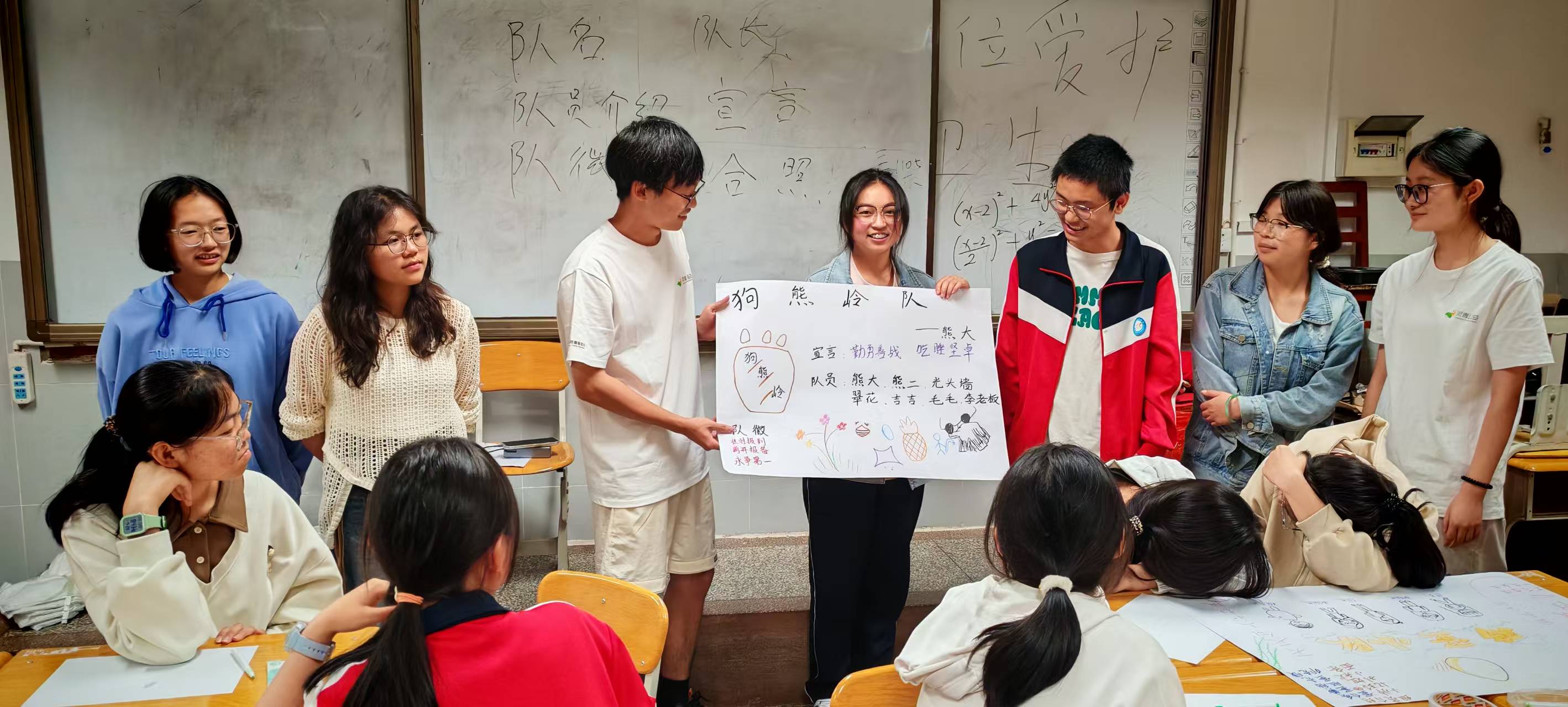 仪式过后,榕生支教队的志愿者们带领同学们按计划开展了破冰活动。志愿者和同学们在自我介绍环节中相识,在制作并展示“个人名片”环节中相知,在分组活动和共同设计组名、组徽以及组旗环节中互助合作,迸发出了高中生与大学生间青春交融的欢乐与激情。