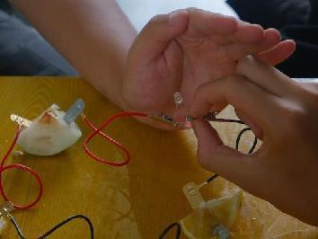 图 5 火灾逃生演练 图 6 化学课上的水果电池实验