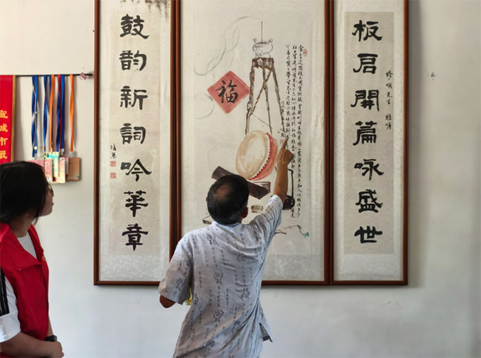 传承团成员零距离体验了皖南大鼓的艺术感染力。李修顺现场演绎经典选段《说唱皖南》,铿锵鼓点如马蹄踏过历史长河,醇厚唱腔似山涧流淌千年故事。鼓声起处,仿佛重现皖南山水间的烟火人间;唱词落时,尽展非遗曲艺的叙事张力。这场沉浸式体验让成员们深刻认识到:非遗不是博物馆里的标本,而是流淌在当代生活中的文化血脉。