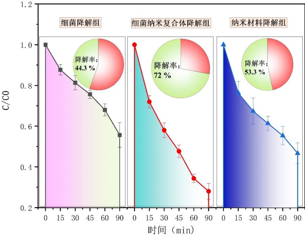 “最关键的是负载比例的调控。”团队成员樊芝伶记得,为了找到细菌与纳米材料的黄金配比,他们在实验室日夜兼程,最终研发出“震荡吸附法”,让复合材料的污染物降解率达到72%,远超单一细菌(44%)和单一纳米材料(53%)。这项突破为技术落地奠定了核心基础。