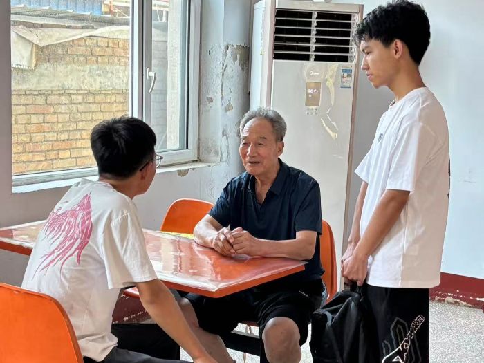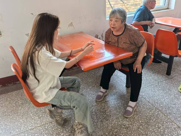 踏入敬老院,同学们便立即投入到开展志愿活动的热情中。敬老院走廊的安静因为同学们的青春力量而注入温暖。同学们有的陪老人漫步听他们介绍敬老院的点滴与生活,有的围坐在老人身旁,倾听他们讲述岁月沉淀的故事,用真诚的交流驱散他们内心的顾忌。食堂里,橙色的餐桌见证着温暖互动,学生们专注地听着那些过去的回忆,青春与暮年的对话,传递着跨越代际的理解与关怀。