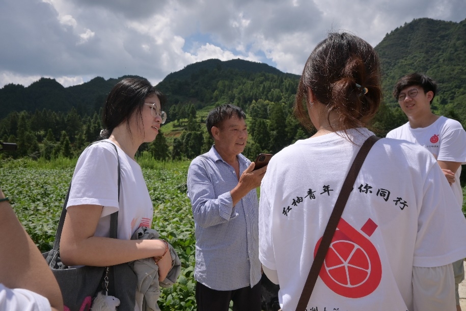 基地考察后,团队转赴小关村与村书记展开座谈。村书记展开一幅“产业地图”:“全村800多户中超500户种植山银花,大部分生花由本地十多家加工厂收购,成品主销成都、长沙药材市场。”面对价格波动,村里通过合作社引导农户精细化采摘,并全力打造“朵花”自有品牌以提升附加值。他还提及采摘季劳动力紧张时需外调人手,以及结合避暑季探索“金银花+民宿”文旅路径的初步设想,让游客带走的不只是产品,更是山野记忆。访谈尾声,书记拍拍团队成员的肩膀,笑着说道:“我们非常欢迎也非常感谢大学生们来‘三下乡’调研,运用你们的所学知识调查产业发展实际情况、提出切实可行建议,并且为山银花产业发展做宣传。”