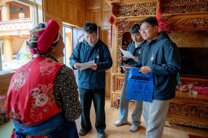 “在云镜牧歌的香格里拉,每一缕经幡飘动都诉说着故事。”团队成员带着调研问卷走访与村民交流,一位藏族阿妈热情邀请团队们进屋参观。