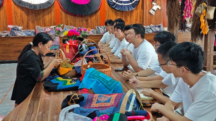 图为花间刺绣工坊曲别李英老师同实践团队座谈交流。江天一 供图