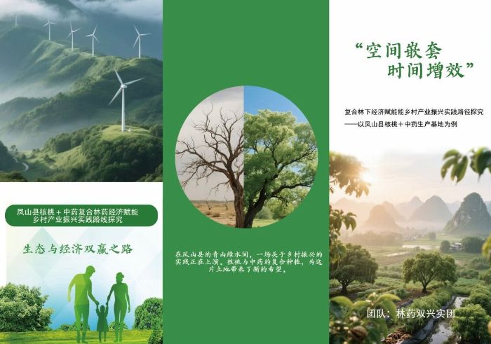 调研行程接近尾声,实践团成员带着精心编制的宣传手册,分别在河池市凤山县、南宁市武鸣区、柳州市三江侗族自治县等地向当地群众发放并介绍这种“一地生双金”的创新模式。宣传手册中重点阐释了凤山县在土地资源有限的情况下,采用“核桃+中药”的种植模式实现“空间立体开发、时间高效填充”的双重增值,用生动实践证明了“绿水青山就是金山银山”的科学理论,最终实现生态效益与经济效益的双赢。每一本手册,每一次讲解,都是对“民族要复兴,乡村必振兴”时代号角的青春回应,将产业振兴的新理念、新希望层层扩散开去。调研队成员们青春的身影与声音,正是青年学子以实际行动投身广袤乡土、贡献智慧力量的生动实践。