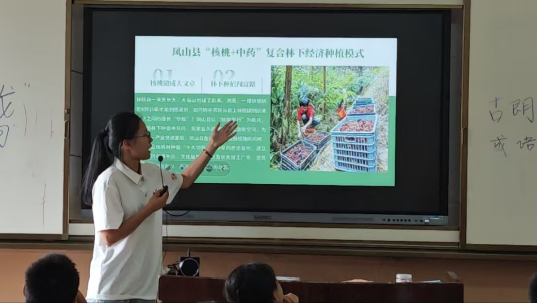 在广西壮族自治区北流市塘岸镇蟠龙村,调研队面向当地的学生举办主题宣讲会,团队成员运用通俗易懂的语言和生动案例,系统阐释了“双轨嵌套”的核心内涵,向同学们介绍了凤山县实现土地资源的高效复合利用与效益倍增。宣讲现场气氛热烈,同学们聚精会神,对如何在有限的土地上“向上”拓展空间、“向时”要效益,让核桃树下曾经的“闲置光阴”也能产出“真金白银”表现出浓厚兴趣。这场深入的知识普及,为后续调研奠定了坚实基础。