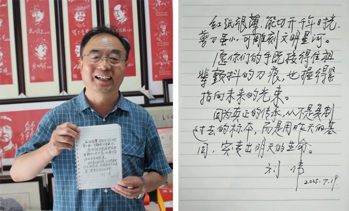 实践团首先来到定西市,对国家级剪纸传承人刘伟先生展开深度访谈,并参观其工作室。推开工作室的门扉,满墙满窗的剪纸作品如红云般扑面而来。刘伟先生的剪纸创作既深植黄河流域与陇原大地的文化根脉,又彰显鲜明的时代特征,尤以人物肖像剪纸见长。他创新性地将“甘肃元素”融入创作,打造“红色剪纸”“彩陶剪纸”“大梦敦煌”“书法剪纸”等系列作品,拓展了剪纸的艺术边界。参观结束后,实践团成员与刘伟先生展开深度访谈,他分享了自己与会宁剪纸的结缘历程,从童年时跟着奶奶、妈妈和姐姐学剪窗花,到如今成为国家级传承人,数十年的坚守让他对剪纸艺术有着深刻的理解。他还现场进行剪纸示范,灵巧的剪刀在纸上翻飞游走,片刻间便勾勒出栩栩如生的图案,让成员们直观感受到传统剪纸艺术的魅力。