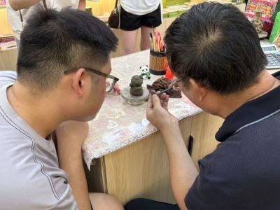 7月20日下午,团队来到了惠山古镇绣嶂街74号泥砂藝匠泥人工作室,惠山泥人制作技艺传承人吴国登师傅热情地迎接了团队,并带领团队参观了工作室。工作室里摆放着各种各样的泥人,其中有大阿福这类经典的惠山泥人形象,更有大熊猫、哪吒、敖丙这种新形象吸引着年轻人和小孩子的眼球。每一件作品都凝聚着吴师傅的心血与智慧,散发着浓郁的传统手工艺的艺术气息。吴师傅向团队详细介绍了惠山泥人的历史渊源、发展脉络以及独特的制作工艺。原来,惠山泥人的制作工艺极为复杂,从选泥、制泥、捏塑、彩绘到开相,每一个环节都有着严格的要求和独特的技巧。其中,“开相”更是惠山泥人的精髓所在,仅靠一支毛笔,吴师傅就能赋予泥人灵动的眼神和生动的表情,让泥人瞬间“活”了起来。随后,团队的队长提出想要亲自上手体验捏泥人,在吴师傅手把手的指导下,队长逐渐上手起来,队员们纷纷用手机记录着这个时刻,即使队长捏泥人的技术远不及吴师傅,但是队长还是全神贯注,沉浸在创作的乐趣中。