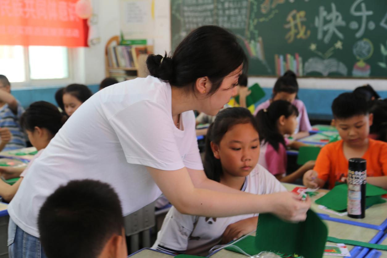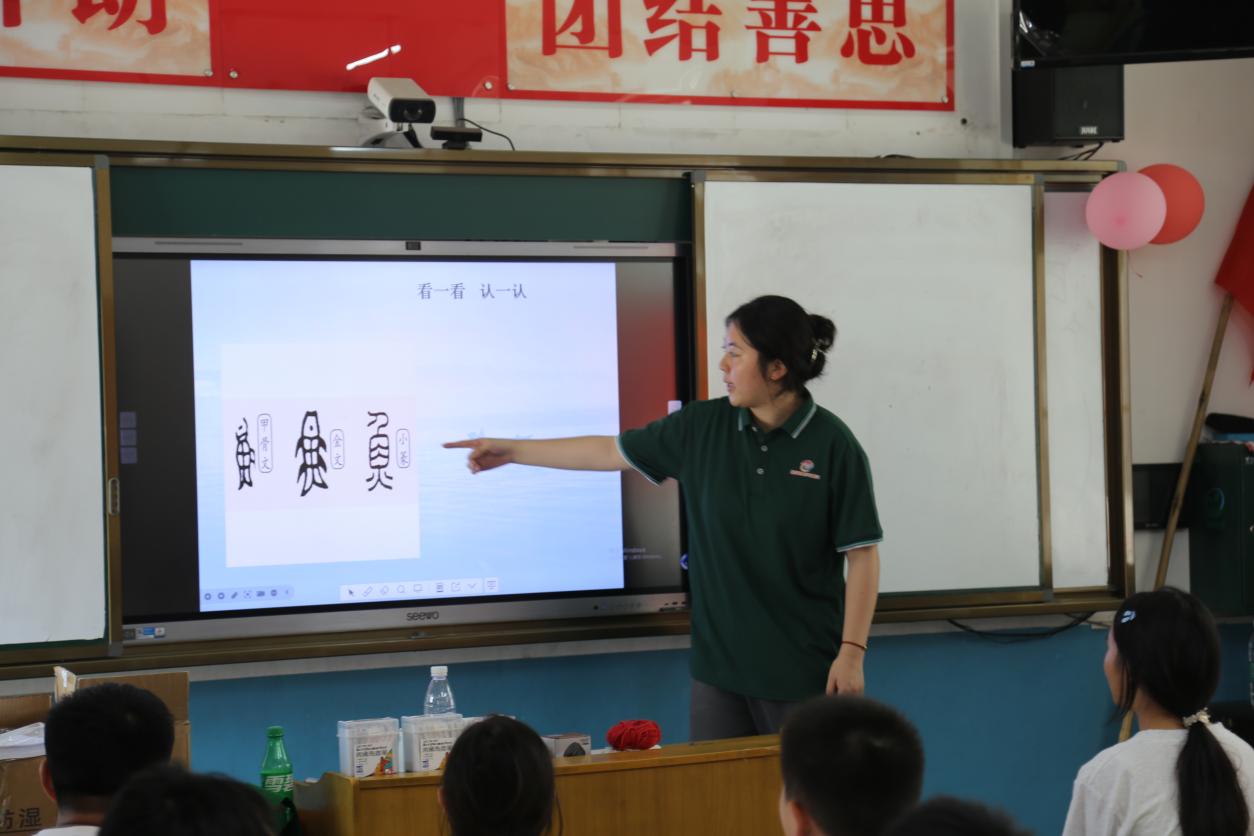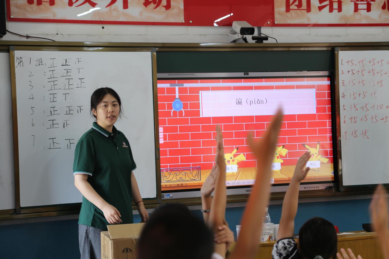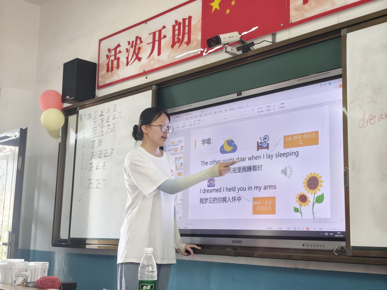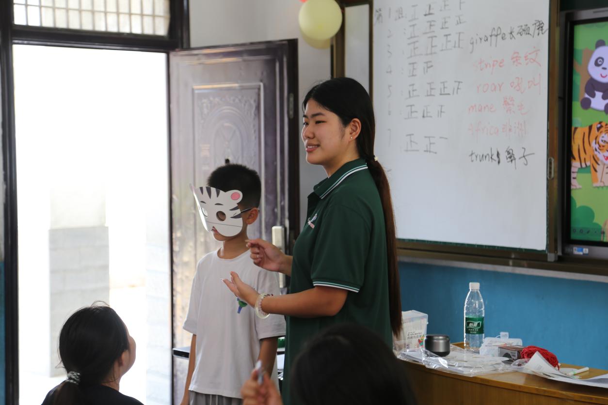 英语儿歌律动课上,孩子们跟着志愿者拍手跺脚,在《youaremysunshine》的旋律里,英语变得不再陌生;动物面具情景对话环节,同学们戴着手工面具的“小狮子”“小兔子”用英语打招呼、猜谜语。团队志愿者通过营造语言环境的方式,大大激发了同学们的学习兴趣。