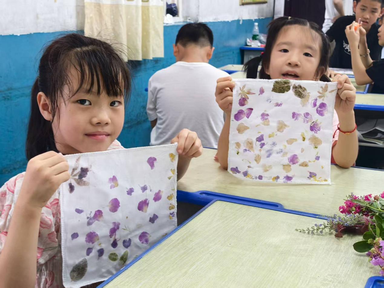 植物拓染课,孩子们跟随老师用锤子轻敲叶片,把叶脉纹理“拓印”在布袋、手帕上,绿叶、黄花化作独一无二的图案,自然素材与艺术创意碰撞,诞生属于自己的“自然艺术品”。