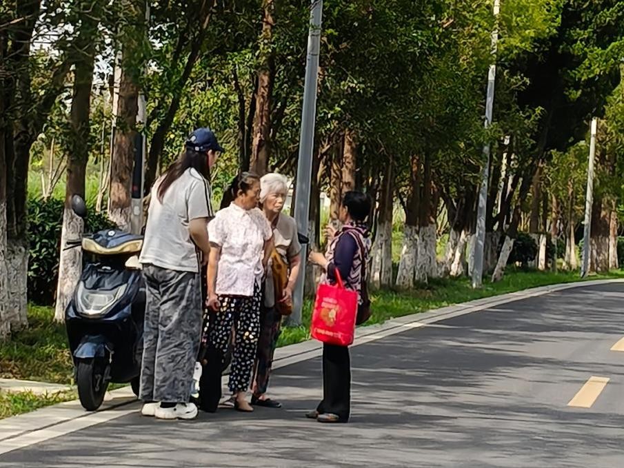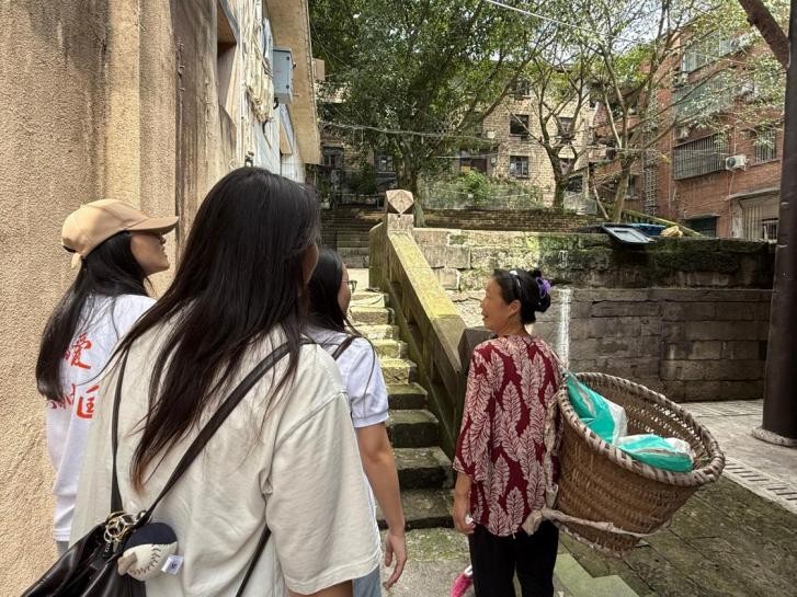 在理论学习的基础上,团队成员来到巴南区二圣镇与当地村民围坐畅谈。面对调研对象多为老年人,存在听力下降与方言隔阂的双重挑战,团队邀请当地同学担任“翻译官”,并用生动语言搭配肢体手势耐心解释,让询问变得温暖顺畅。巴南区率先形成的落户农民农村权益自愿有偿退出“1+3+1”政策体系,使得昔日零散的土地在社会资本的助力下新生,有效激活了乡村产业活力。一位队员感慨道:“退出后的土地用来发展民宿、乡村旅游,又让这里焕发出了别样的生机。”