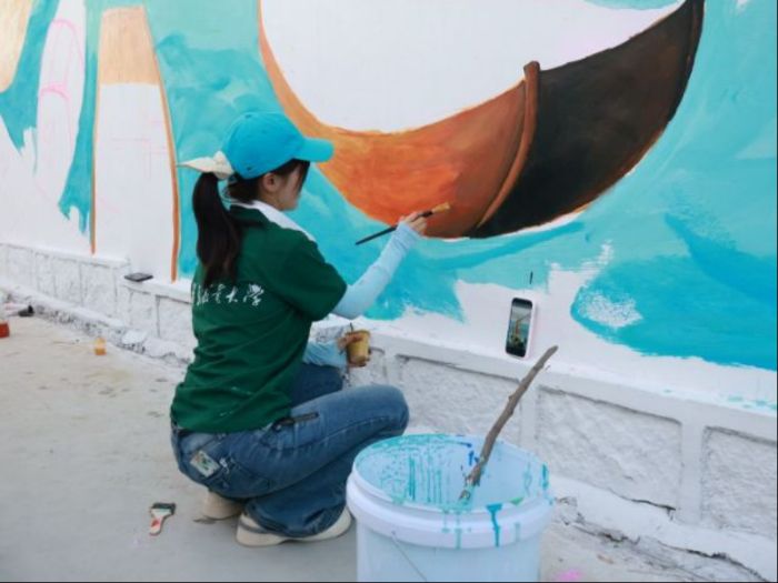 创作中,队员们分工协作:有人蹲在墙根用粉笔勾勒初稿,有人站在脚手架上调制矿颜料,有人顶着烈日细致填色,路过的村民也时不时驻足欣赏。经过数日努力,原本单调的墙面焕然一新,成为展示四女寺镇文化底蕴的亮丽风景线。最终,原本单调的墙面蜕变为讲述古镇故事的“文化长廊”,既扮靓了乡村街巷,更让沉睡的历史有了可视可感的新载体。这次墙绘活动不仅美化了乡村环境,更让队员们在实践中加深了对运河文化的理解。