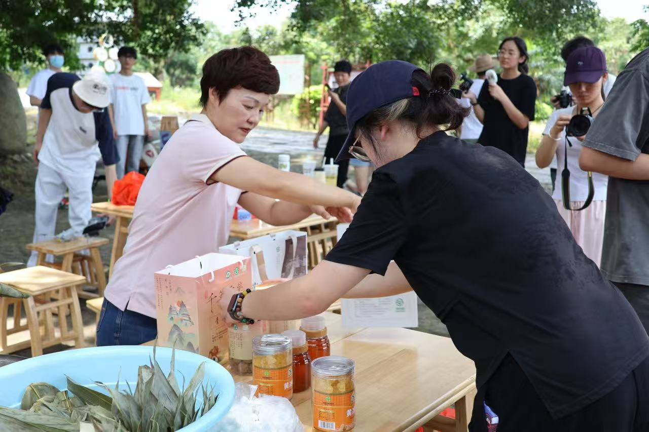实践队携带无人机、高清摄像机、微距镜头等专业设备奔赴拍摄现场,以镜头定格乡村振兴生动图景,涵盖青山碧水、古厝街巷、非遗美食、产业新貌等多个方面。在古榕广场,队员们聚焦当地特色美食,以光影呈现舌尖上的乡村记忆 —— 微距镜头下,蒸腾热气中龙眼丸子汤翻滚的浓稠汤汁、龙眼白丸子汤晶莹剔透的软糯质感清晰可辨;通过慢动作拍摄,裹着粽叶清香的龙眼粽被层层剥开后,糯米与果肉的金黄色泽令人垂涎。除自然风光与美食文化外,实践队还深入挖掘村落人文底蕴,在百年宗祠内采用多机位环绕拍摄,完整记录传统技艺的精湛过程。