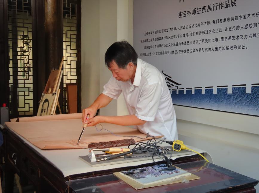 7月8日下午,实践队又于建昌古城拜访了彝族火绘(烙画)技艺传承人洪昌恒老师。在洪老师的工作室,他为我们现场展示了火绘技艺的核心技法,讲解了如何通过控制烙铁的温度、力度和速度来表现丰富的线条与明暗层次。