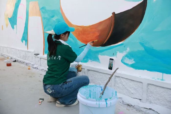 实践团首先扎根实地调研,深度挖掘四女寺镇特有的“四女奉亲 孝德文化与运河文化底蕴。在此基础上,团队成员化身“文化画师”,将传统元素融入乡村风貌设计,通过细腻笔触再现“四女奉亲”的孝德典故,以浓墨重彩描绘运河往昔商船往来的繁华盛景。在短短十天内,队员们高效完成了一系列精美墙绘作品,让沉睡的历史故事“跃”上墙面,将无形的文化遗产转化为乡村公共空间中可触可感的文化景观。