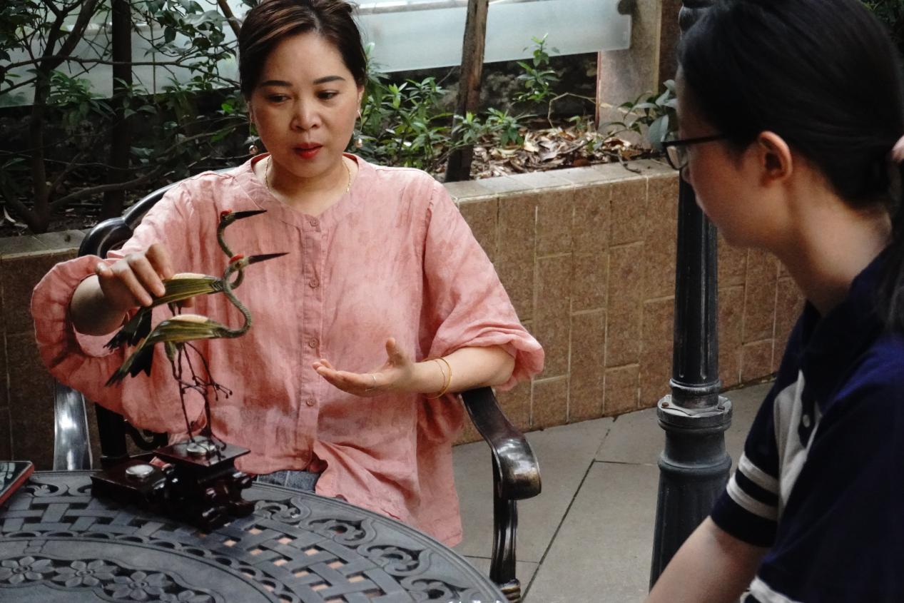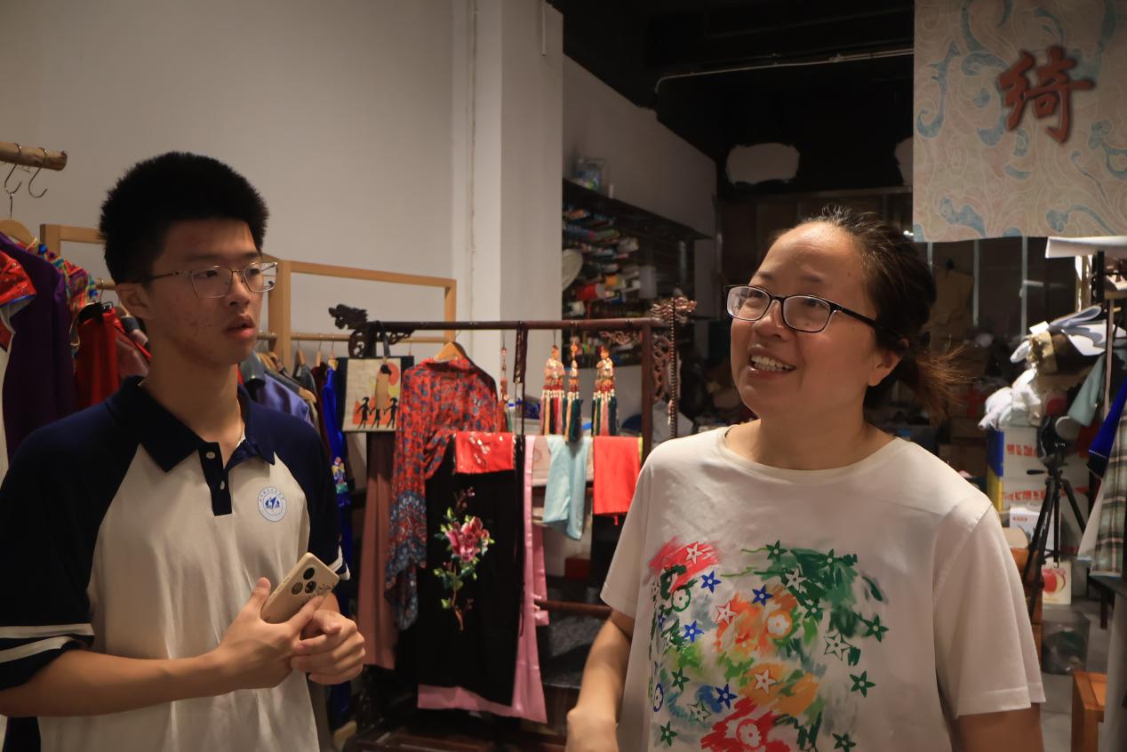7月10日上午,实践队成员拜访蜀绣传承人张春瑜的工作室,在采访中详细了解了蜀绣的技法与现代发展模式。张老师聚焦市场需求,设计出胸针、耳钉、手机支架、冰箱贴、电脑包等多种多样的文创产品,享受自由创作的工作环境,也在创新中传承与发扬蜀绣技艺。