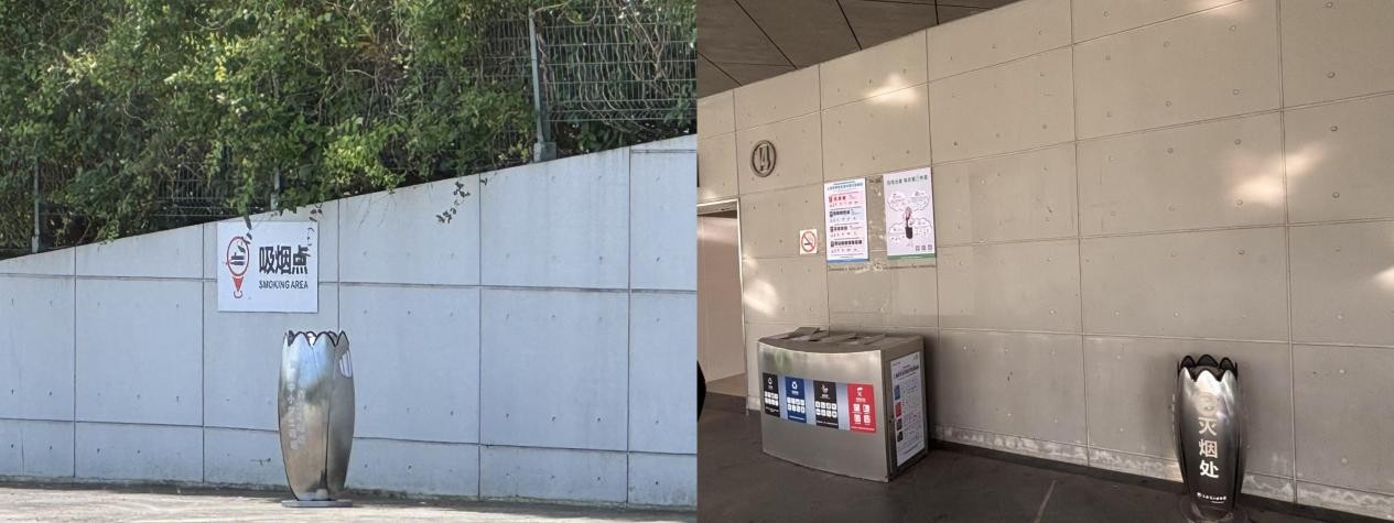 团队发现,园区禁烟标识数量少且位置隐蔽,更存在与“全面禁烟”政策相悖的不规范吸烟点——一处紧邻检票排队区,另一处仅在洗手间门口设置灭烟柱充当“吸烟点”,均不符合上海市室外吸烟点设置标准。当团队向工作人员反映时,得到的回应却是“园区太大管不过来”,“主要靠自觉”,凸显出管理执行的乏力。
