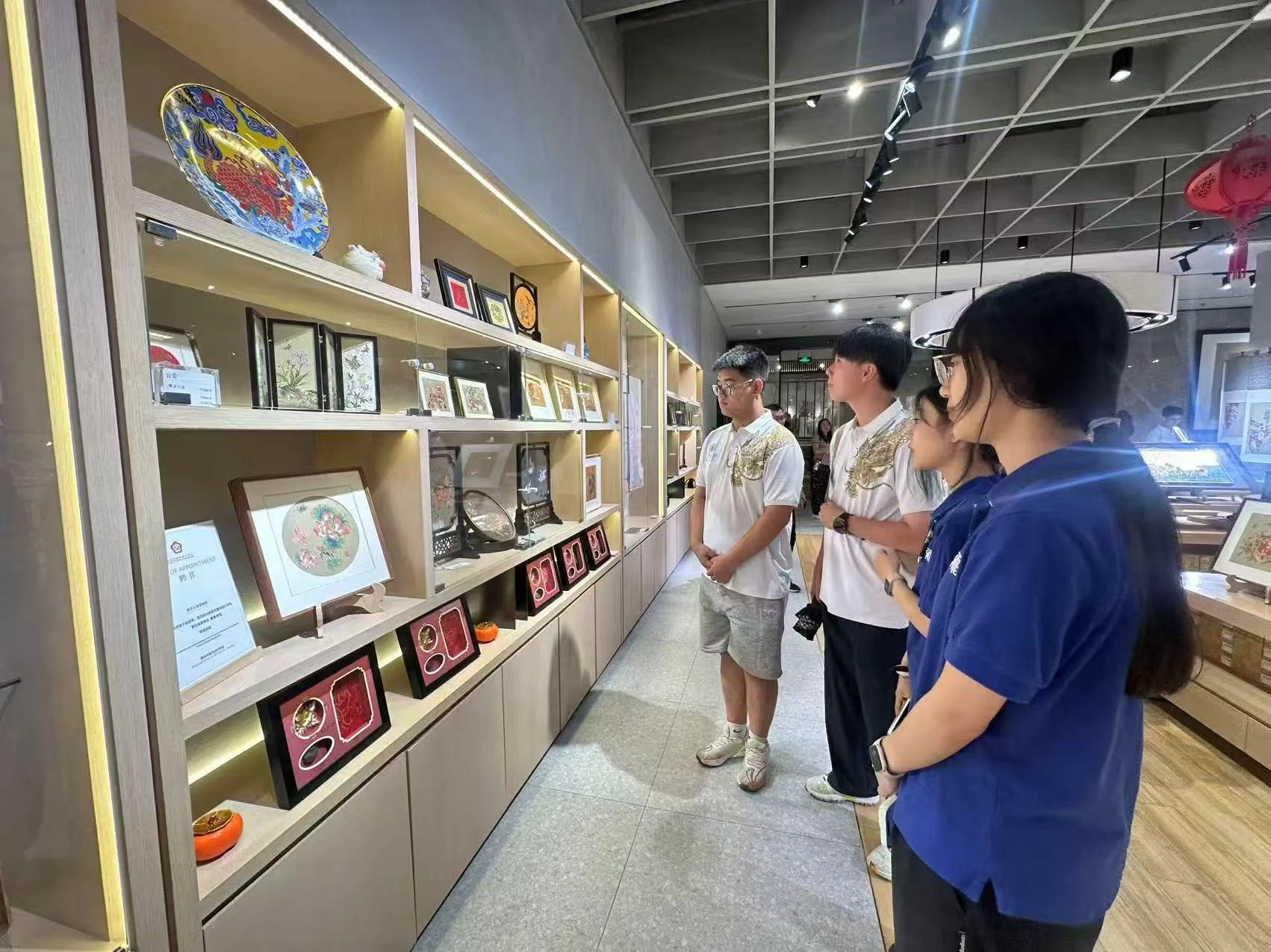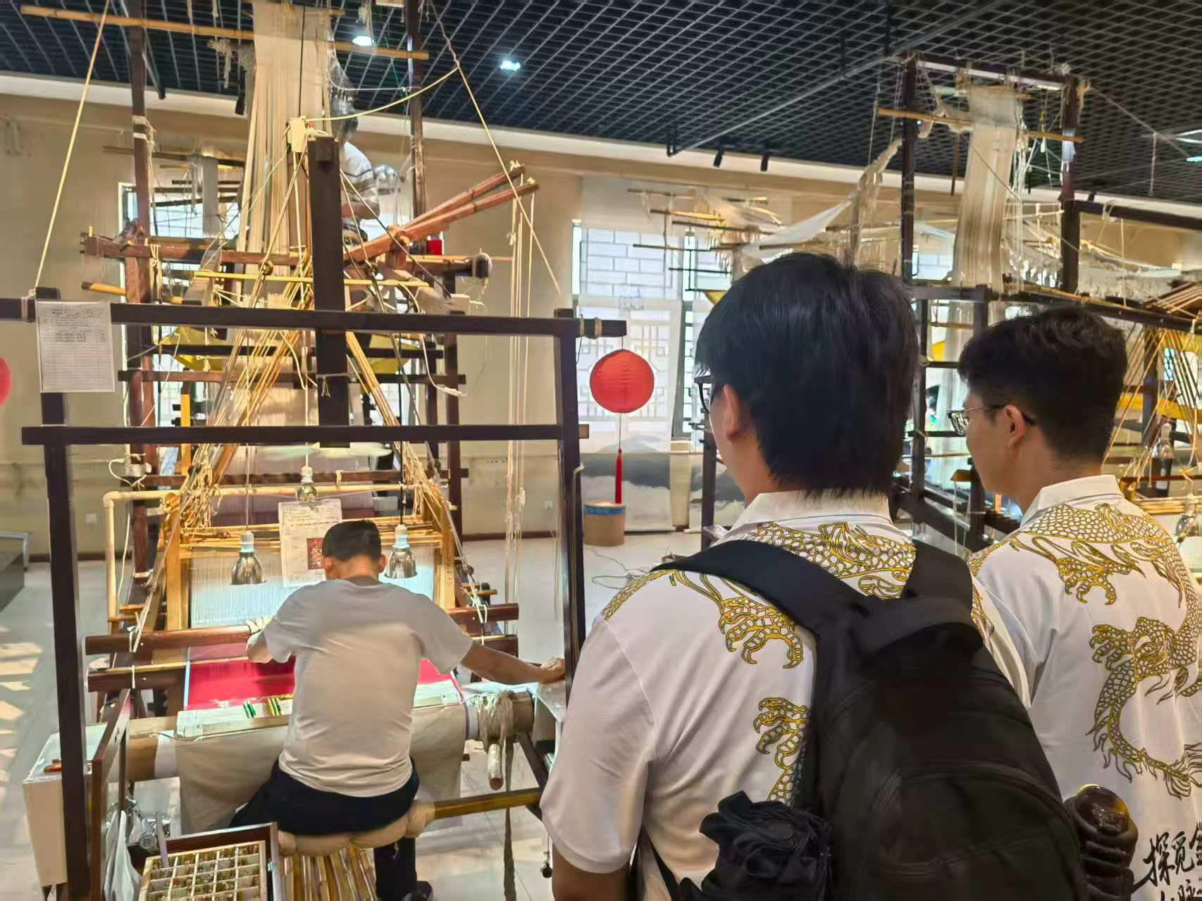 实践队首站走进南京云锦博物馆,开启非遗文化探寻。作为“锦中之冠”,南京云锦自东晋“锦署”设立便绵延千年,明清官办织造局的垄断更使其集历代织锦工艺之大成。在馆内,队员们惊叹于“寸锦寸金”的极致工艺:纯桑蚕丝为经,真金、纯银捻线为纬,需两名工匠在大花楼木织机上配合,每日仅能织就数寸。二层演示区,“通经断纬”“挖花妆彩”的“妆花”工艺现场呈现,拽花工拉花本、织手引彩纬的协作,让“逐花异色”的奇迹直观可感。镇馆之宝“明万历皇帝龙袍妆花纱袍料”复制品尤为震撼:17米长的锦缎上,17条金龙以真金、孔雀羽线织就,复刻了失传300多年的“纱地妆花织金”技艺,全球仅存两件。而一层文创区将云锦纹样融入现代服饰、家居的设计,更让队员们看到“古老技艺活在当下”的创新路径,让队员们明白传承不是守旧,而是让千年智慧与时代同行。
