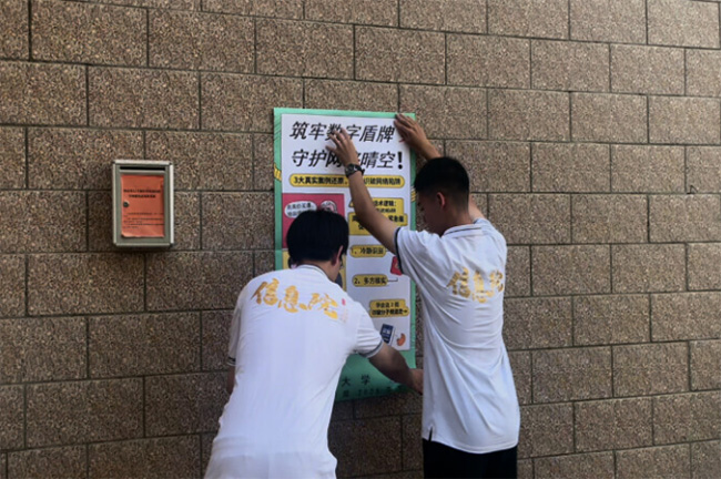 实践团划分4个小组,靶向社区公告栏、活动中心、小区出入口等人流密集区,在各社区公告栏、活动中心及小区出入口等人员密集区域,规范张贴网络安全主题海报。