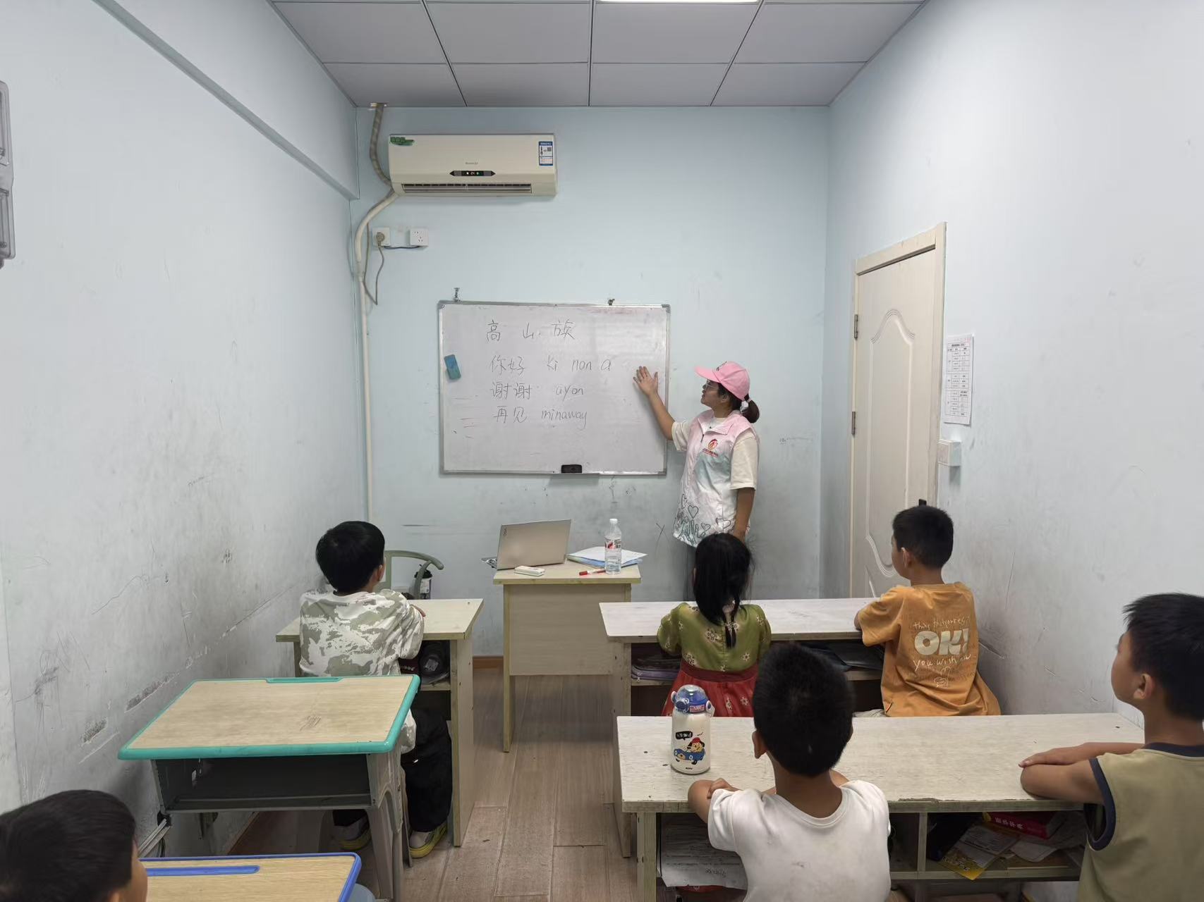 在民族语言教学环节,选取“你好(ki non a)”“谢谢(ayon)”“再见(mianway)”等简单实用的高山族日常用语,通过拼音标注、发音示范和逐字领读等方式,让孩子们学习发音与含义。期间,穿插“你说我猜”“快速抢答”等语言小游戏,志愿团队成员用高山族语说词语,孩子们抢答汉语意思,极大活跃课堂氛围,加深孩子们对高山族语言的记忆理解,让原本陌生的民族语言变得鲜活有趣 。