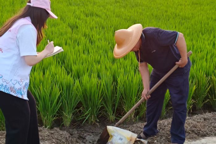 在田间实践环节,志愿队与基地农民水稻栽种员展开深入交流。多位拥有十年以上种植经验的“老把式”结合亲身经历,讲述基地推行标准化管理后,水稻种植在抗病能力提升、产量增长等方面的显著变化,直观展现科技指导对农业生产的推动作用。随后,队员在农技人员的指导下挽起裤脚、踏入田间,亲手参与除草、补苗等农事操作,在弯腰劳作中感受“汗滴禾下土”的艰辛,也深刻理解粮食生产对各民族群众生活保障的重要性,进一步强化对不同地区劳动者的共情,让民族团结的认知从理论走向实践。