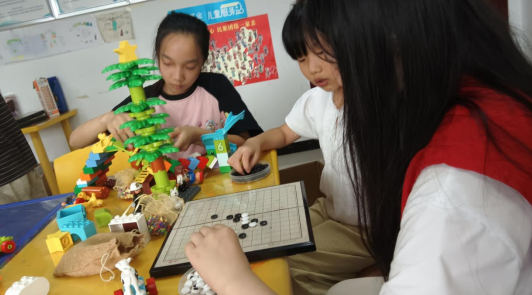 图为志愿者耐心陪伴小朋友下棋。周明杰摄